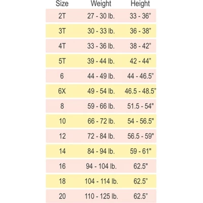 | 6-6x | 49-54 Lbs. | 24 3/4 | 25 3/4 | 46-48” |