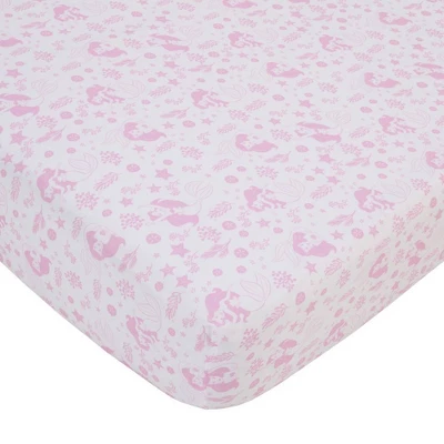 The Little Mermaid, Ariel, Cute by Nature 3-piece crib bedding set includes a comforter, fitted crib sheet and dust ruffle. The set fits a standard crib mattress that measures 28″ x 52″. All pieces are made of super-soft fabrics for a snuggly night’s sleep. Beautiful colors combined with a favorite Disney princess make this set one that will stand out in your baby’s room. The comforter measures 33″ x 42″ and includes a sweet, under-the-sea theme. Shades of pink, blue, aqua and coral make this Disney Baby bedding set cute and versatile. Easy to clean and care for!